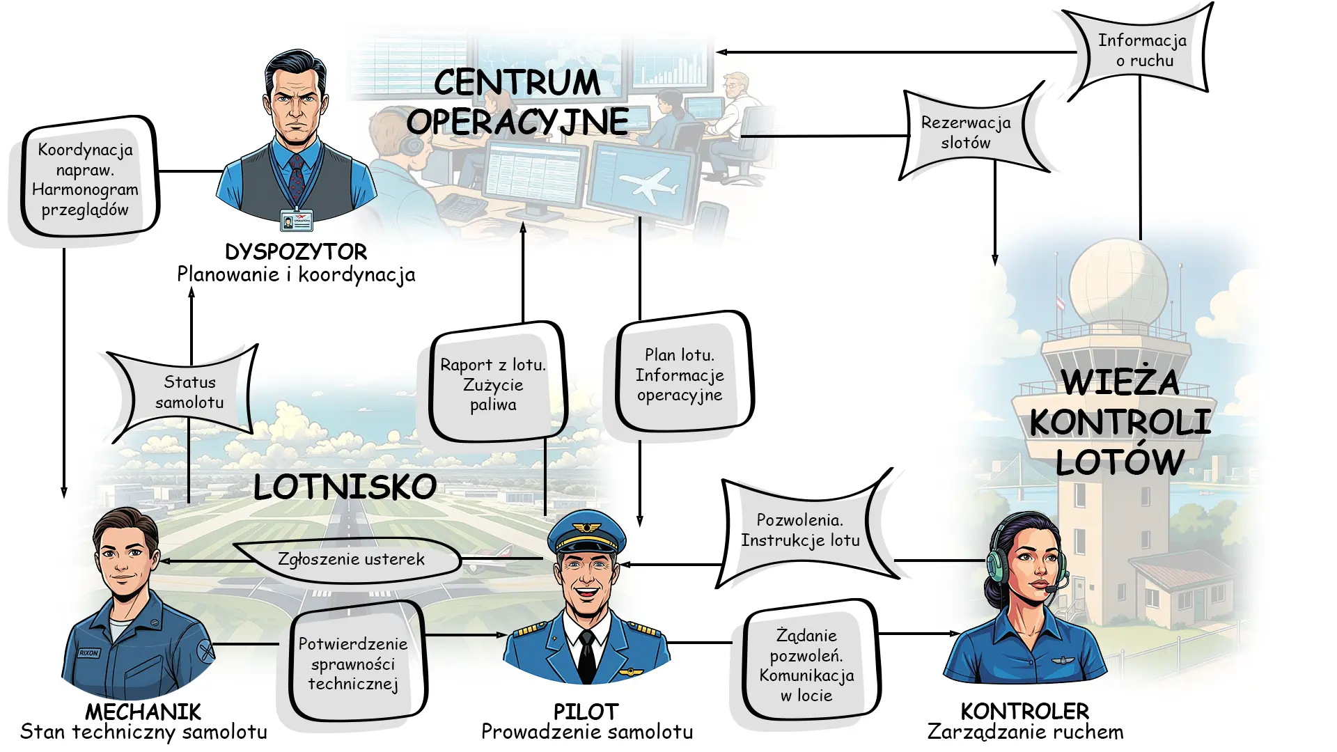 Wszystkie role w lotnictwie tworzą zintegrowany system, w którym komunikacja jest kluczowa. Dyspozytor przekazuje pilotowi plan lotu i informacje operacyjne. Mechanik potwierdza sprawność techniczną samolotu. Kontroler ruchu prowadzi maszynę przez przestrzeń powietrzną.