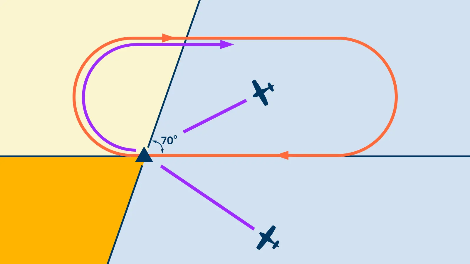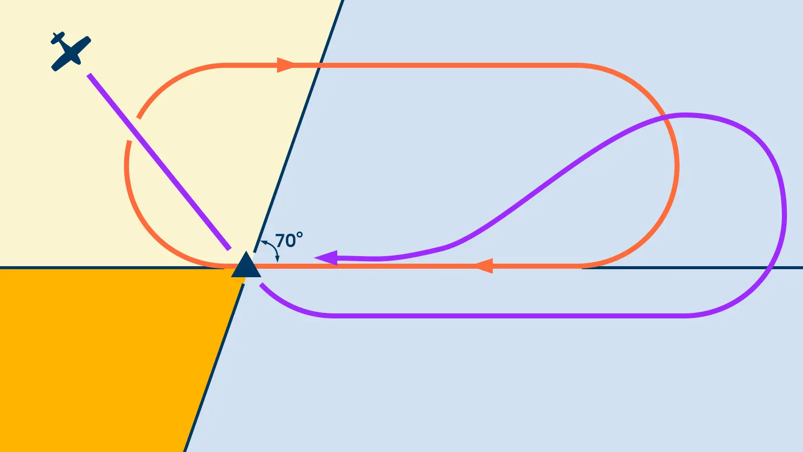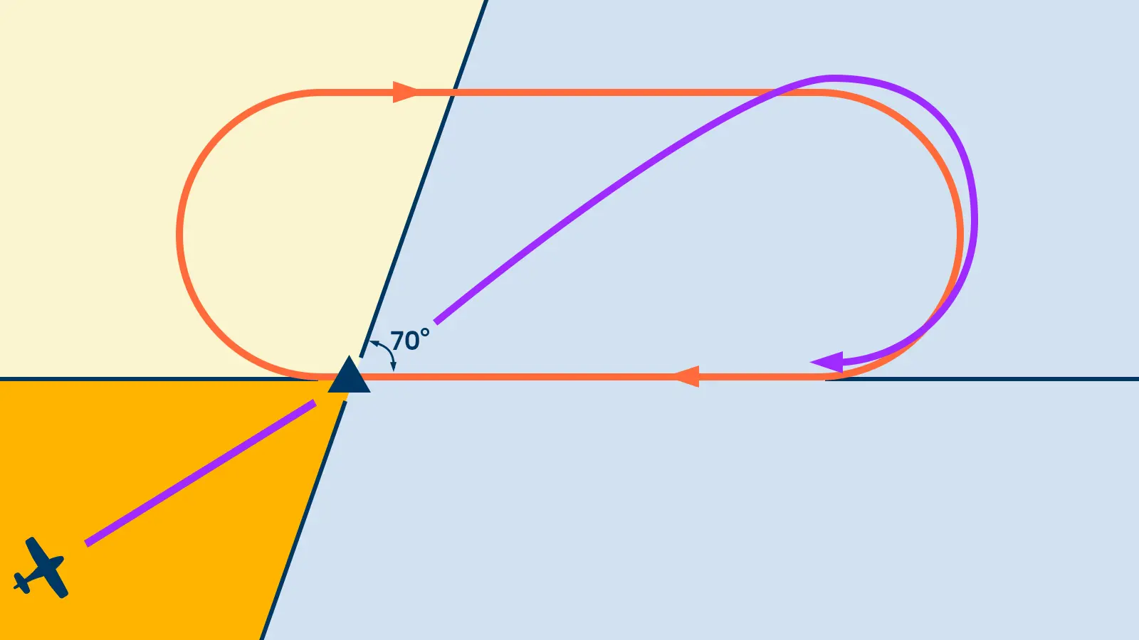 Po przekroczeniu pozycji oczekiwania (z przeciwnej strony) pilot wykonuje skręt, aby utrzymać kąt 30° do kursu powrotnego. Leci przez około minutę, a następnie wykonuje skręt, aby powrócić na odcinek dolotowy.