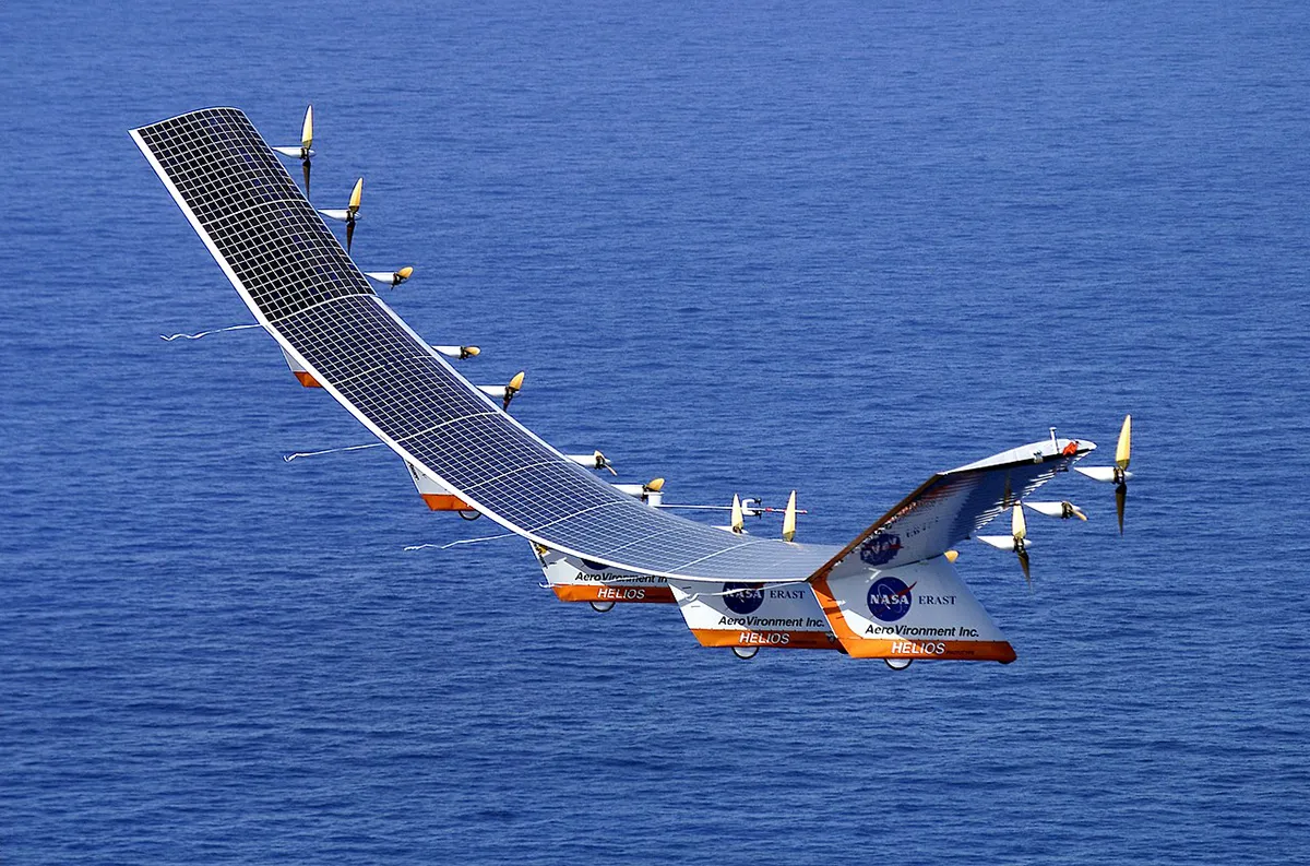 NASA Helios Prototype to eksperymentalny dron zaprojektowany do lotów na dużych wysokościach i testowania energii słonecznej jako źródła napędu. Wyposażony w 14 silników elektrycznych i panele słoneczne, Helios osiągnął rekordową wysokość 29,5 km w 2001 roku.