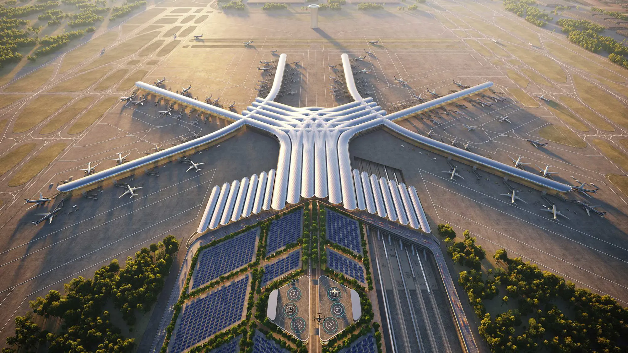 – Podziemną stacją kolejową (14 metrów pod lotniskiem, w tunelu przebiegającym przez strefę midfield)