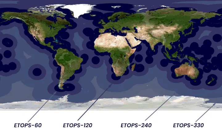 Nazwa odnosi się do maksymalnego czasu lotu do zapasowego lotniska w przypadku awarii jednego silnika. W lotnictwie komercyjnym ETOPS decyduje o tym, czy dwusilnikowy samolot może lecieć trasami nad oceanami, pustyniami czy obszarami polarnymi.