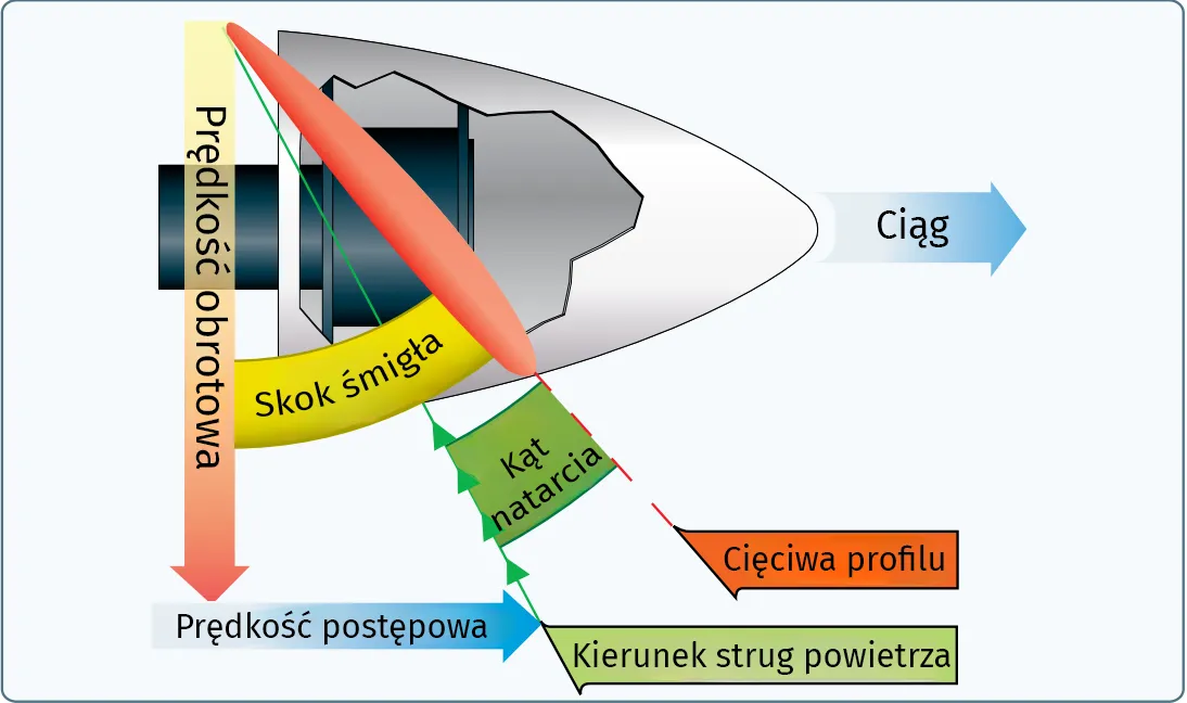 Działanie opiera się na analizie ruchu obrotowego i liniowego. Kąt natarcia, powstający między strumieniem powietrza a łopatą, ma kluczowe znaczenie dla generowania ciągu. W czasie pracy zespołu napędowego powietrze za nim zostaje przyspieszone, co tworzy nadciśnienie i umożliwia wytworzenie siły ciągu. Różnice ciśnień po obu stronach łopaty, podobnie jak w przypadku skrzydła, są efektem jej aerodynamicznego kształtu.