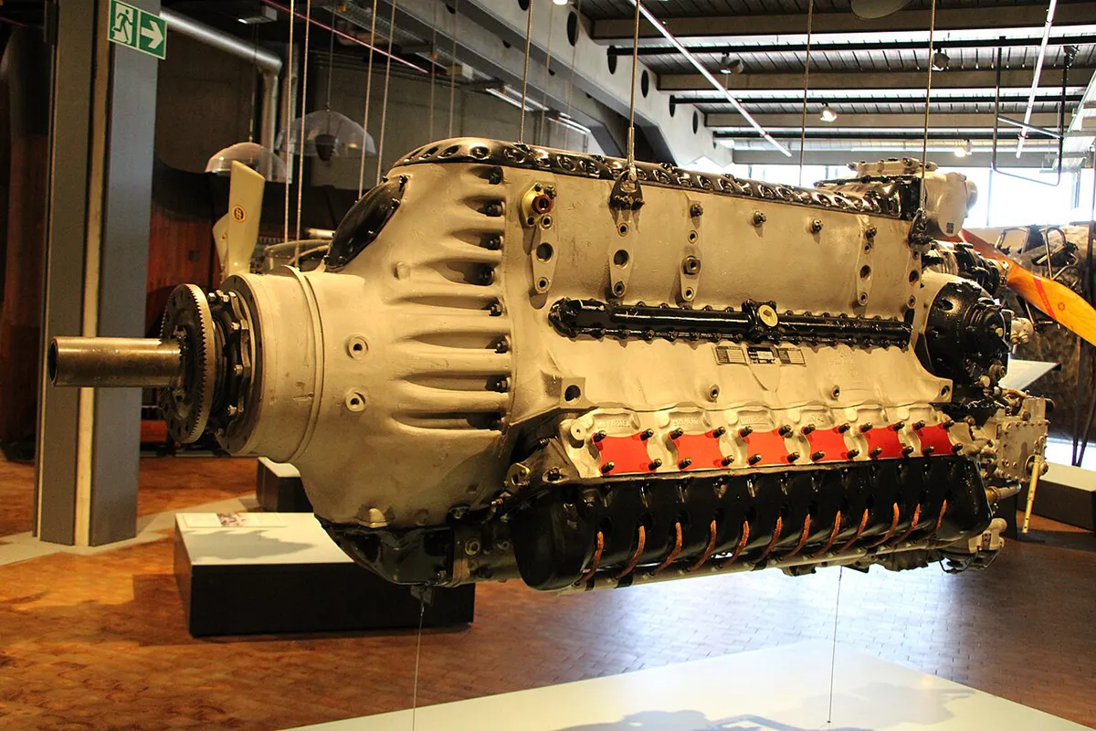 Francuski 24-cylindrowy silnik rzędowy Hispano-Suiza H Type 82 z 1938 r., ze zbiorów Muzeum Lotnictwa Polskiego w Krakowie.