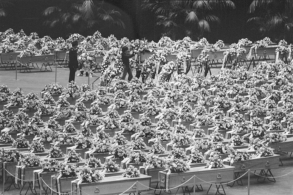 Trumny ze zwłokami ofiar katastrofy (Teneryfa, kwiecień 1977)
