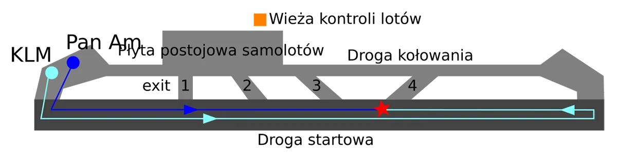 Przebieg zdarzeń: samolot KLM (jasnoniebieski) kołuje na koniec pasa startowego, następnie zawraca i rozpoczyna start, podczas gdy na tym samym pasie znajduje się drugi samolot – maszyna PanAm-u (ciemnoniebieski); czerwona gwiazdka – miejsce kolizji, tuż przed czwartym zjazdem